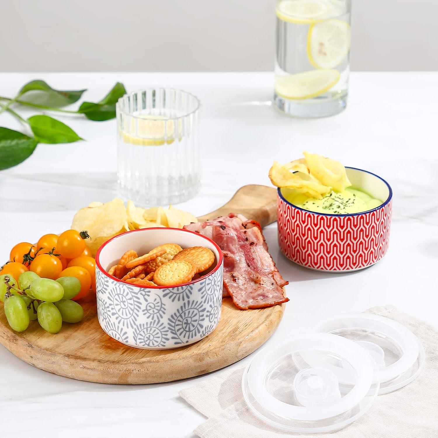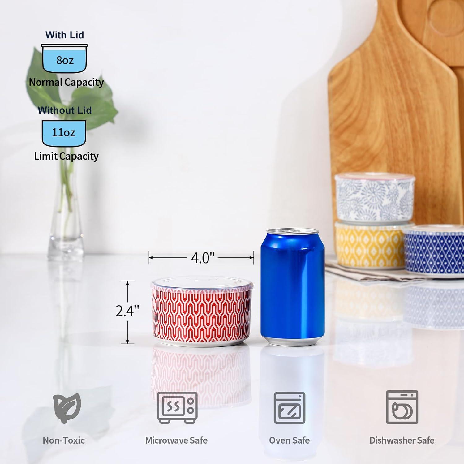 VERSATILE SMALL BOWLS WITH LIDS – These ceramic bowls come with airtight lids that ensure your food stay fresh and safe during storage or transport. With deep and straight shape, these 8oz ceramic bowls are suitable for holding small portions of salads, snacks, ice cream, yogurt, fruit, sauces, condiments, and side dishes.