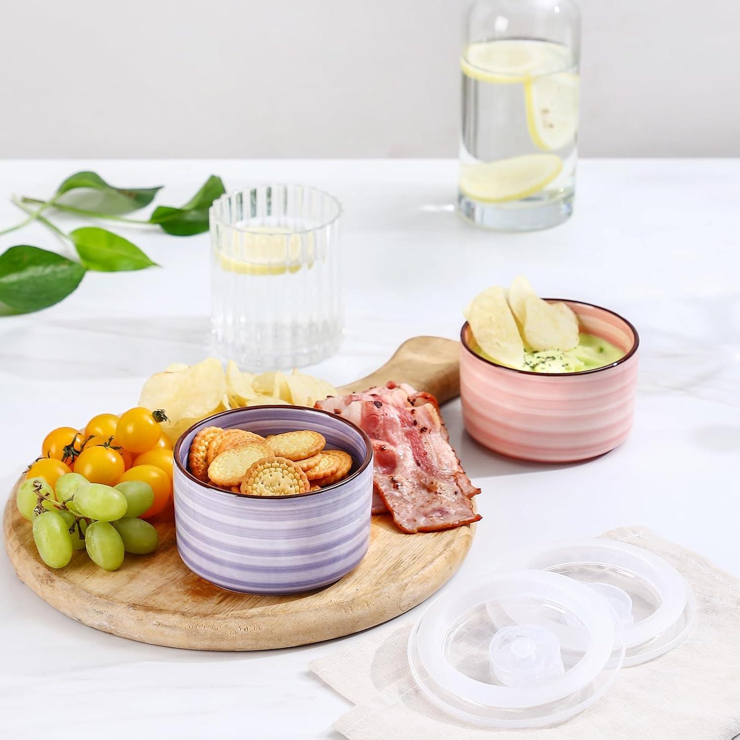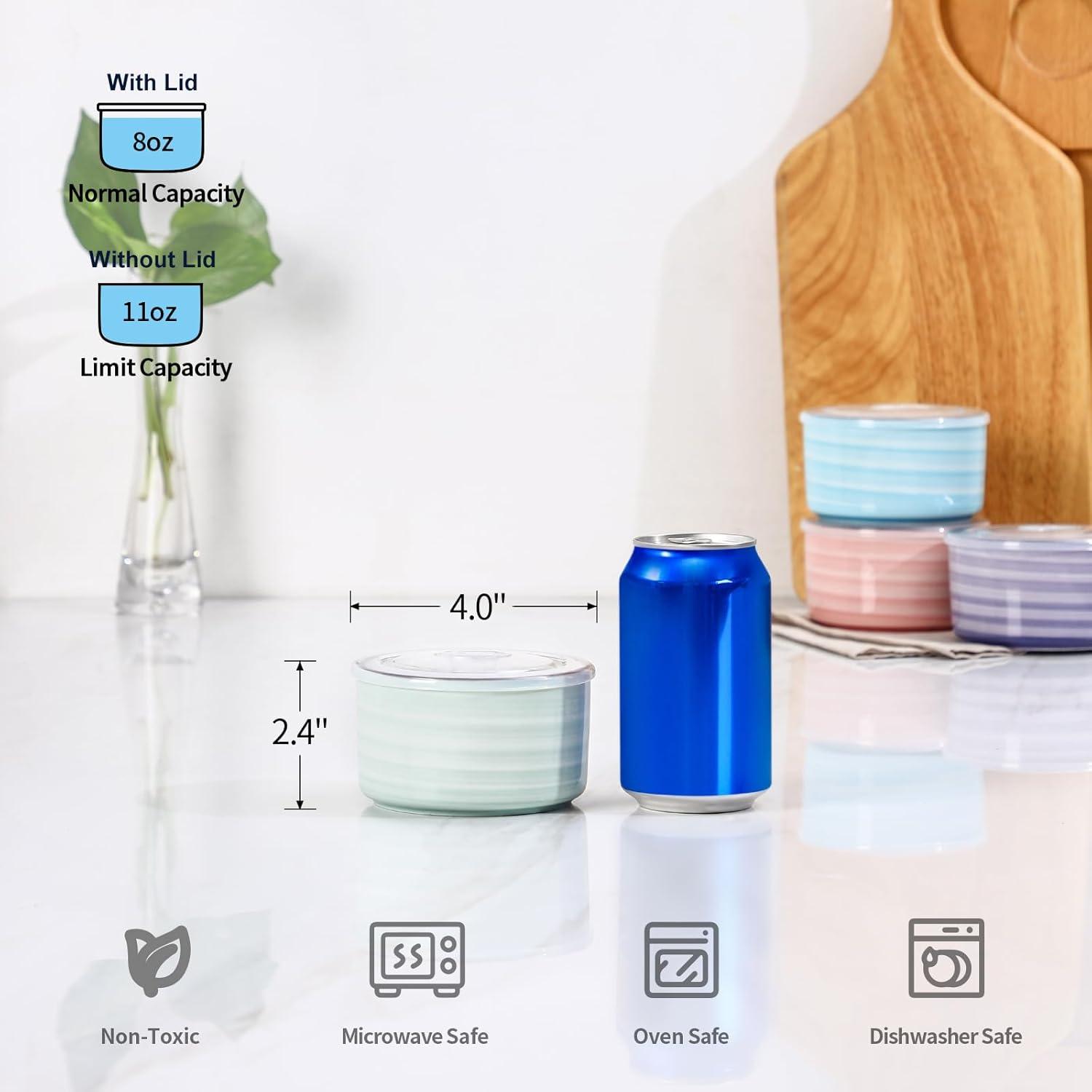 VERSATILE SMALL BOWLS WITH LIDS – These ceramic bowls come with airtight lids that ensure your food stay fresh and safe during storage or transport. With deep and straight shape, these 8oz ceramic bowls are suitable for holding small portions of salads, snacks, ice cream, yogurt, fruit, sauces, condiments, and side dishes.