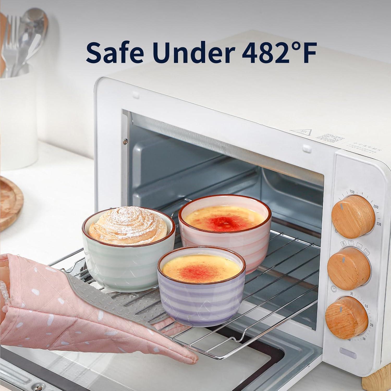 GOOD HEAT-RESISTANCE & EASY CLEANUP – Our Creme Brulee Ramekins with covers are made of premium porcelain that hold up well from freezer to oven cooking (up to 482°F). These ramekin dishes boast completely smooth glaze that shields against stains, making cleaning a breeze. Silicone lids can be effortlessly cleaned in your dishwasher.